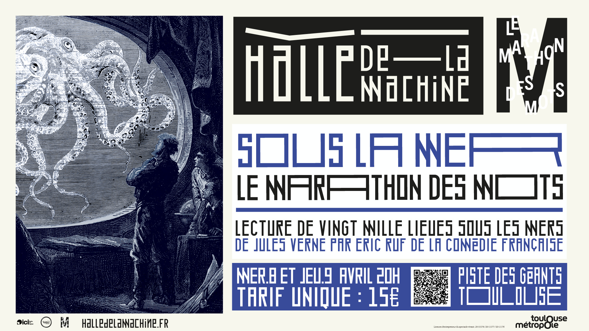 Tour à tour le Capitaine Némo, le Professeur Pierre Arronax, le harponneur Ned Land et le Commandant Farragut, le comédien et metteur en scène embarque le public dans une lecture itinérante de morceaux choisis du fameux roman Vingt Mille Lieues Sous les Mers de Jules Verne.