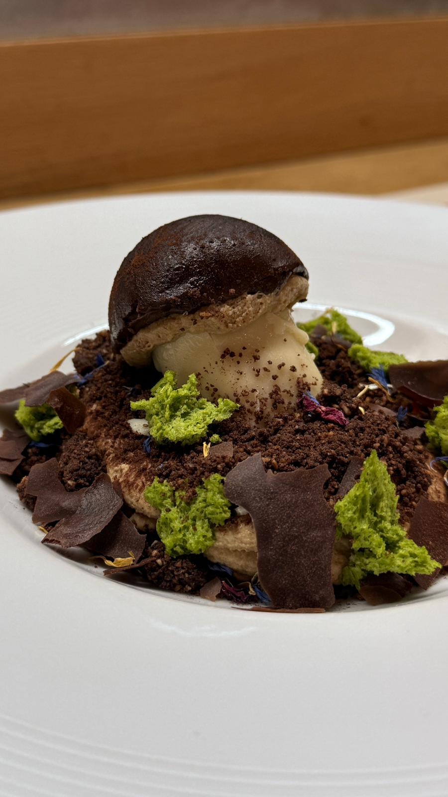 Crémeux chocolat cèpes, ganache montée praliné, noisettes et cèpes, crumble cacao, gavotte cacao, sponge cake persil, ganache montée chocolat blanc praliné et noisettes.